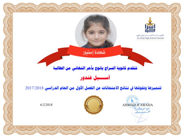 تكريمًا لجهودهم كافأت إدارة ثانويّة السّراج /يانوح المتفوّقين في اللّغة العربيّة في امتحان السّعي الثّاني ووزّعت عليهم شهادات التّقدير متمنّيةً لهم دوام التّميّز .
